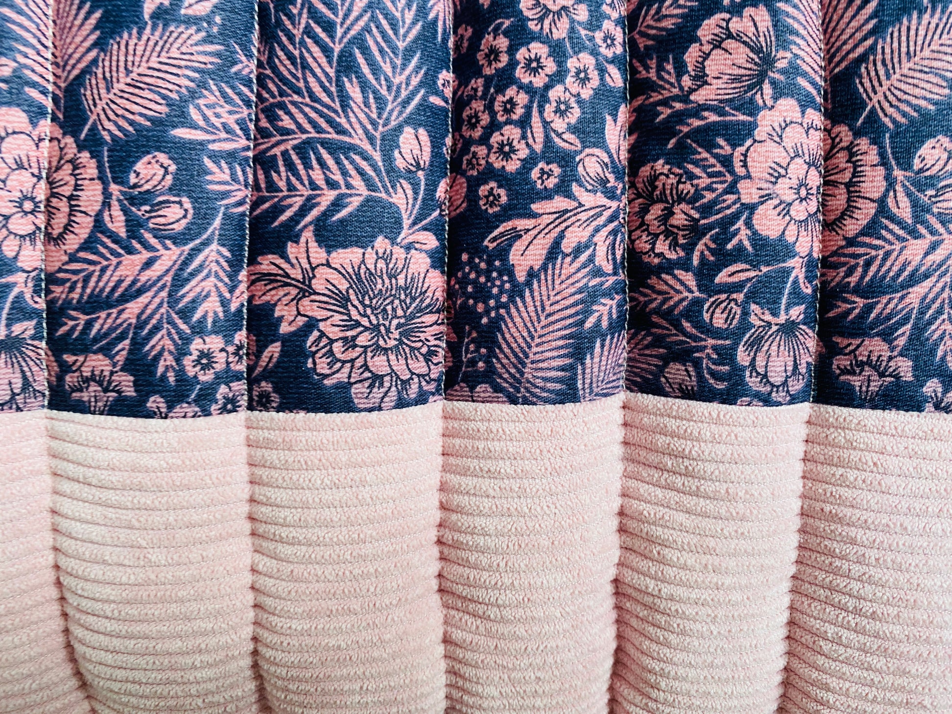 The materials used are cotton and polyester. A floral and corduroy. The poly cotton blend provides better durability and requires less maintenance. Poly cotton has great wrinkle-resistance.